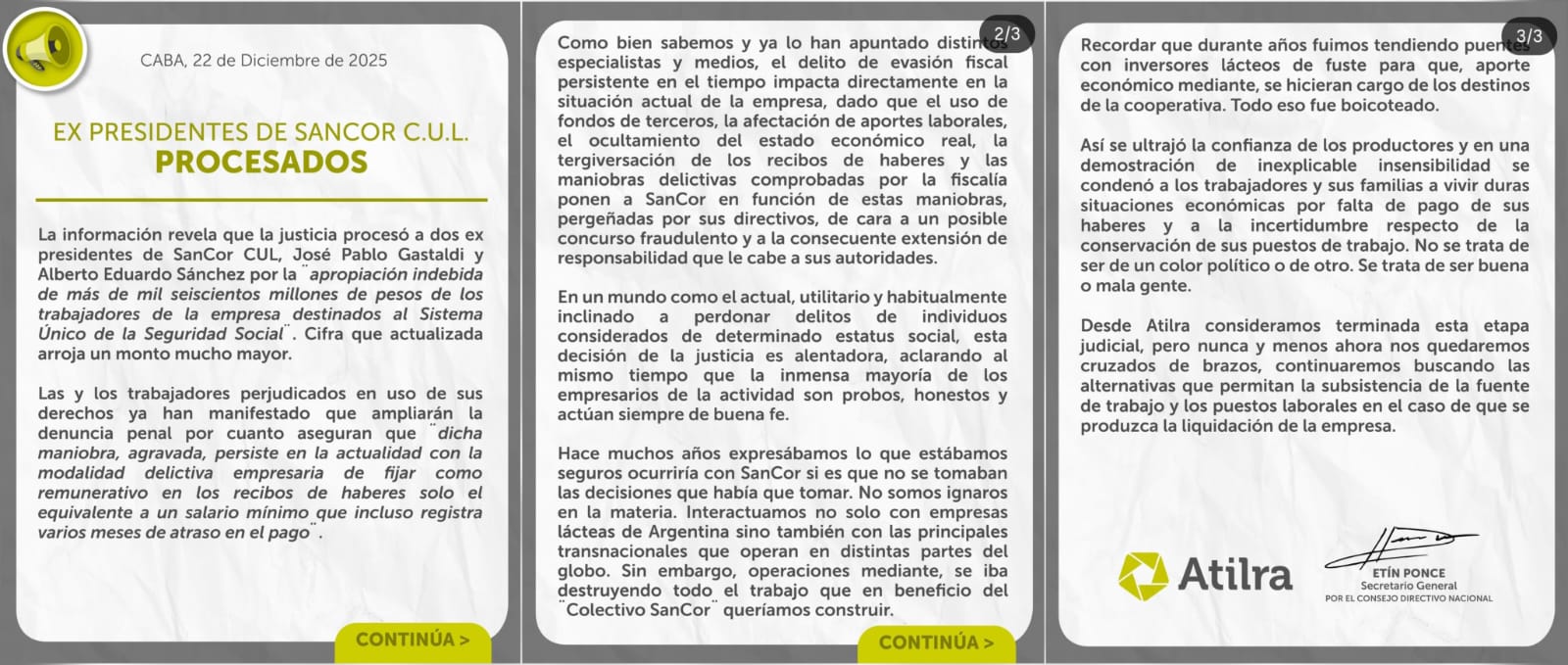 La resolución judicial generó una fuerte reacción del gremio lechero. Desde la Asociación de Trabajadores de la Industria Lechera de la RepĆŗblica Argentina (ATILRA) anunciaron que ampliarĆ”n la denuncia penal y advirtieron que las maniobras investigadas no sólo se habrĆan producido en el pasado, sino que continuarĆan en la actualidad bajo nuevas modalidades.