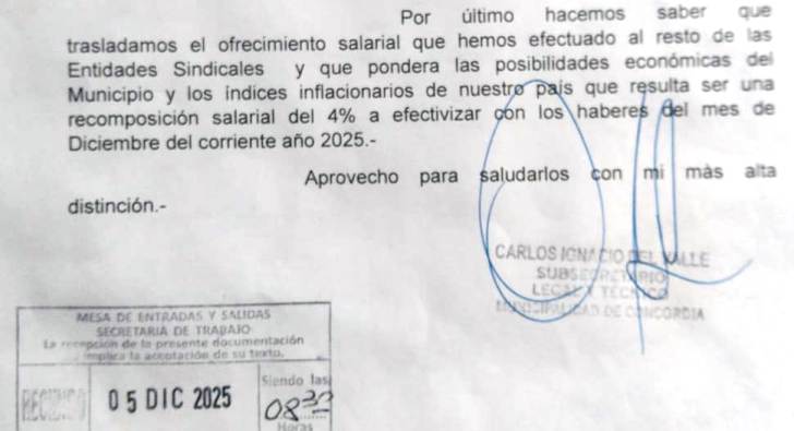 “Por último, hacemos saber que trasladamos el ofrecimiento salarial que hemos efectuado al resto de las entidades sindicales y que pondera las posibilidades económicas del Municipio y los índices inflacionarios de nuestro país que resulta en una recomposición salarial del 4% a efectivizar con los haberes del mes de diciembre del corriente año 2025”, se señala en el último párrafo de la nota enviada a la Secretaría de Trabajo firmada por Carlos Ignacio del Valle ,Subsecretario Legal y Técnico de la Municipalidad de Concordia.
