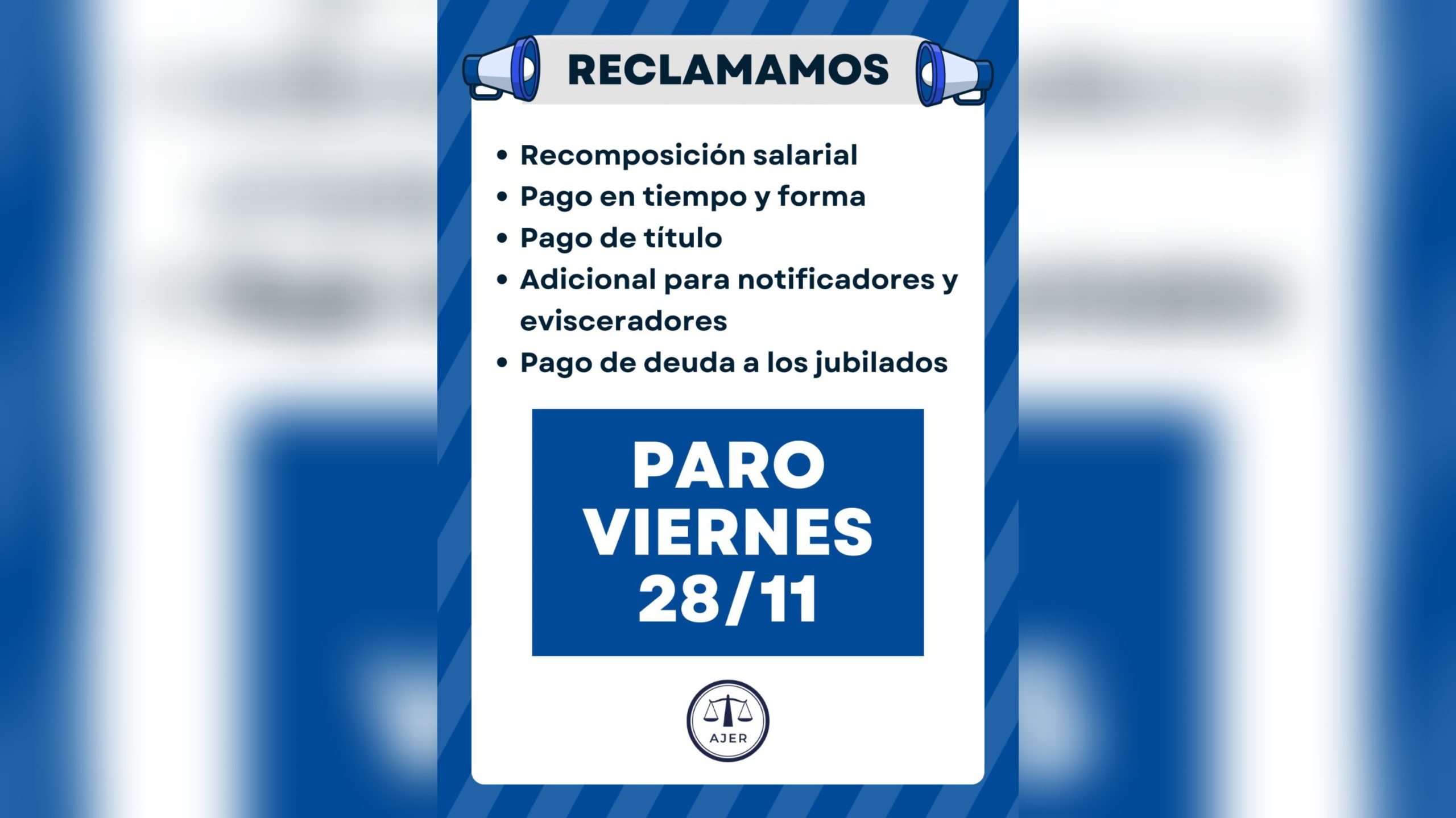 Al respecto, el secretario general de AJER, José María Segura, confirmó que ante la falta de respuesta del gobierno al pedido de una recomposición salarial de los trabajadores judiciales, resolvieron hacer un paro de 24 horas este viernes 28 de noviembre.
