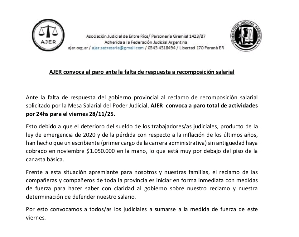 En ese sentido, AJER convocó a todas y todos los trabajadores judiciales de la provincia a sumarse de manera masiva al paro total del día viernes, con el objetivo de visibilizar la situación y exigir respuestas concretas al Ejecutivo provincial.