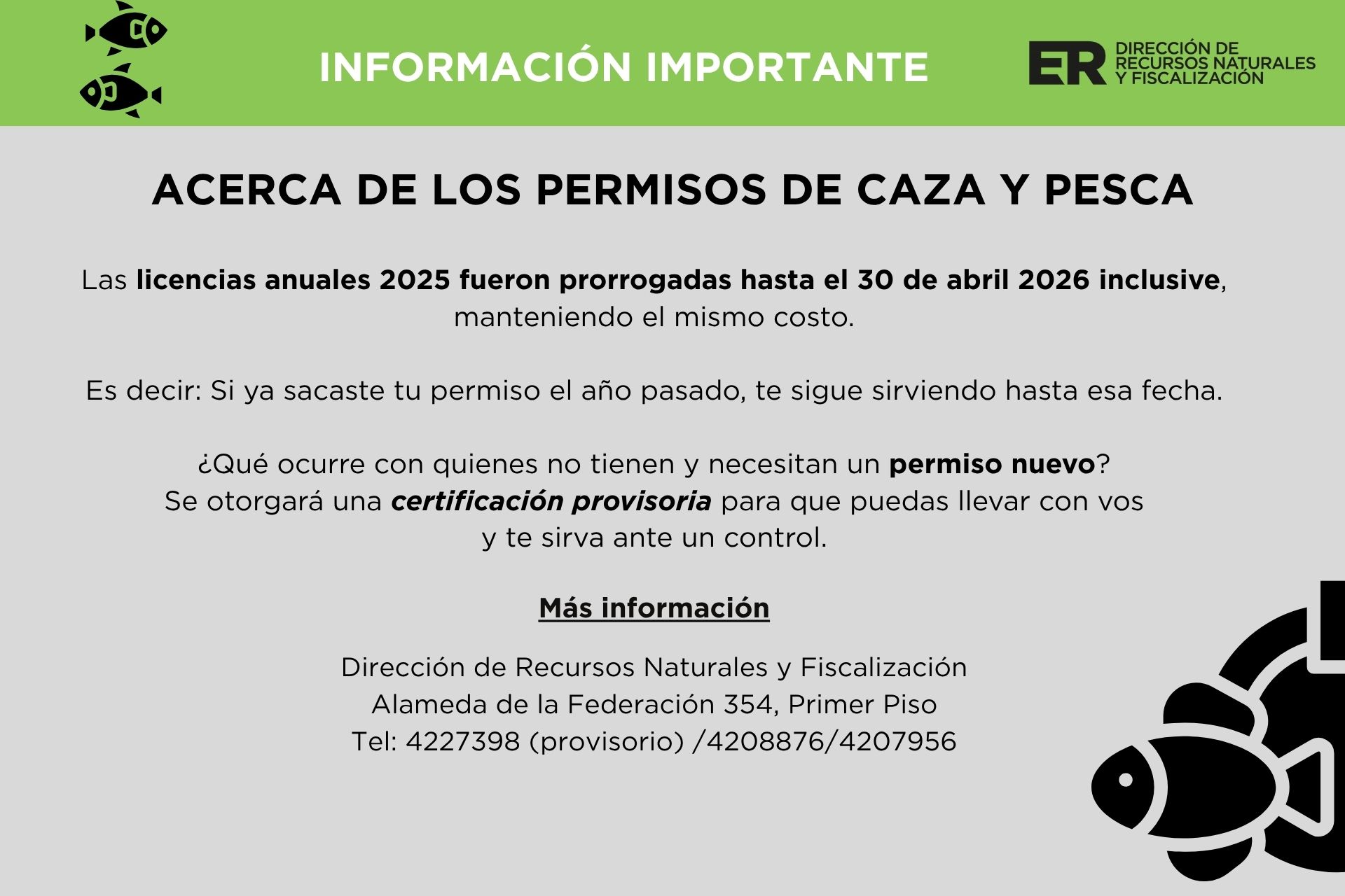 El organismo, dependiente de la Secretaría de Agricultura, Ganadería y Pesca provincial, confirmó que las licencias anuales correspondientes a 2025 fueron prorrogadas hasta el 30 de abril inclusive, en el marco de la Resolución 0083/26 DRNF. De esta manera, quienes ya cuenten con su permiso vigente podrán continuar utilizándolo sin necesidad de renovarlo de forma inmediata.