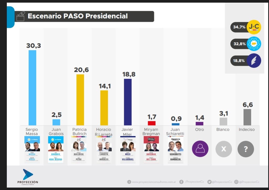 El informe pertenece a la consultora Proyección, quien relevó el escenario de las PASO presidenciales. La fórmula Sergio Massa – Agustín Rossi tiene un 30,3 por ciento de intención de voto, muy por encima del 2,5 por ciento de su rival en la interna, Juan Grabois – Paula Abal Medina. En segundo lugar se encuentra la fórmula Patricia Bullrich – Luis Petri, con 20,6 puntos; por sobre Horacio Rodríguez Larreta – Gerardo Morales, que acumulan 14,1 puntos.