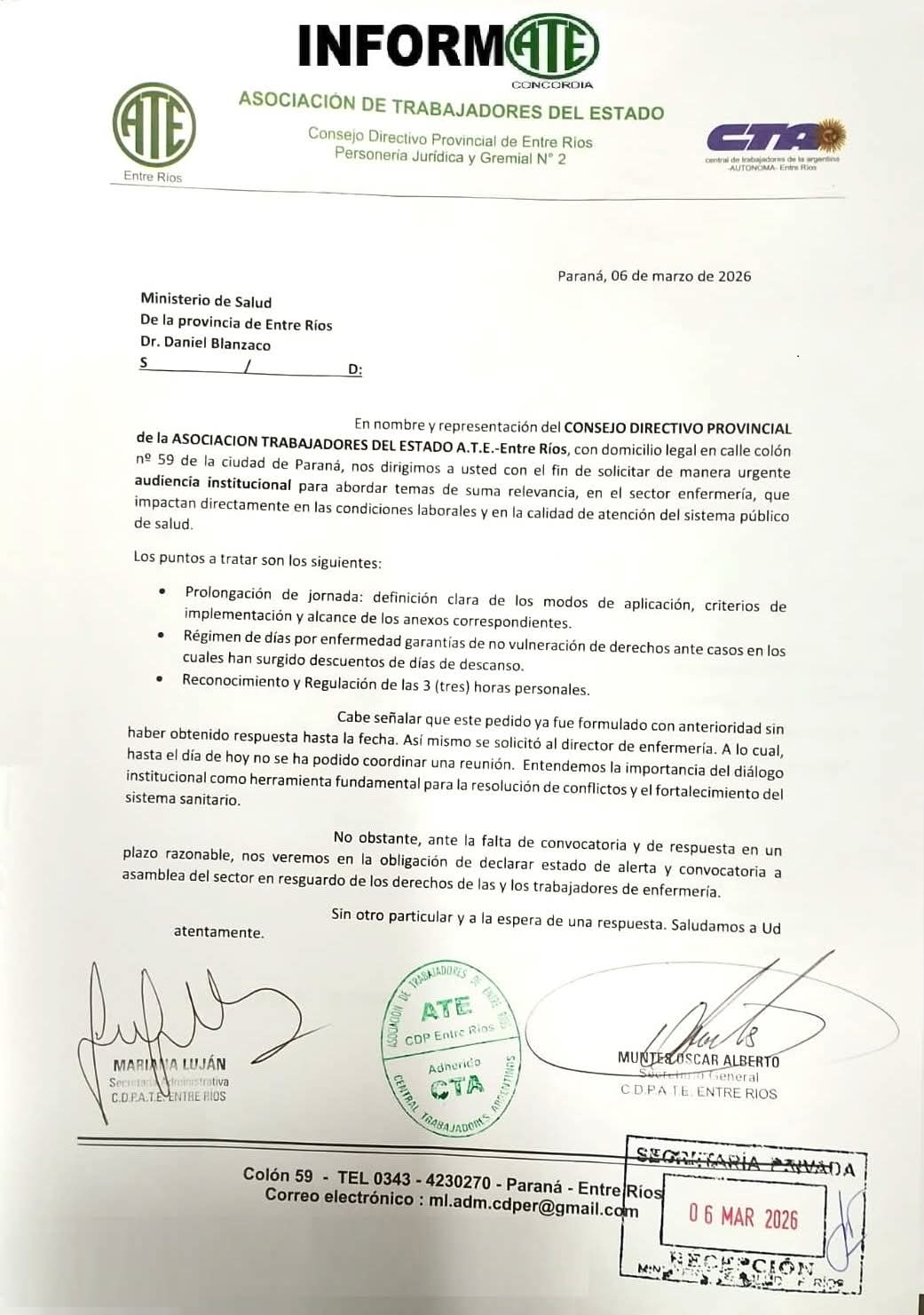 El documento lleva la firma del secretario general de ATE Entre Ríos, Oscar Muntes, y de la secretaria administrativa, Mariana Luján.