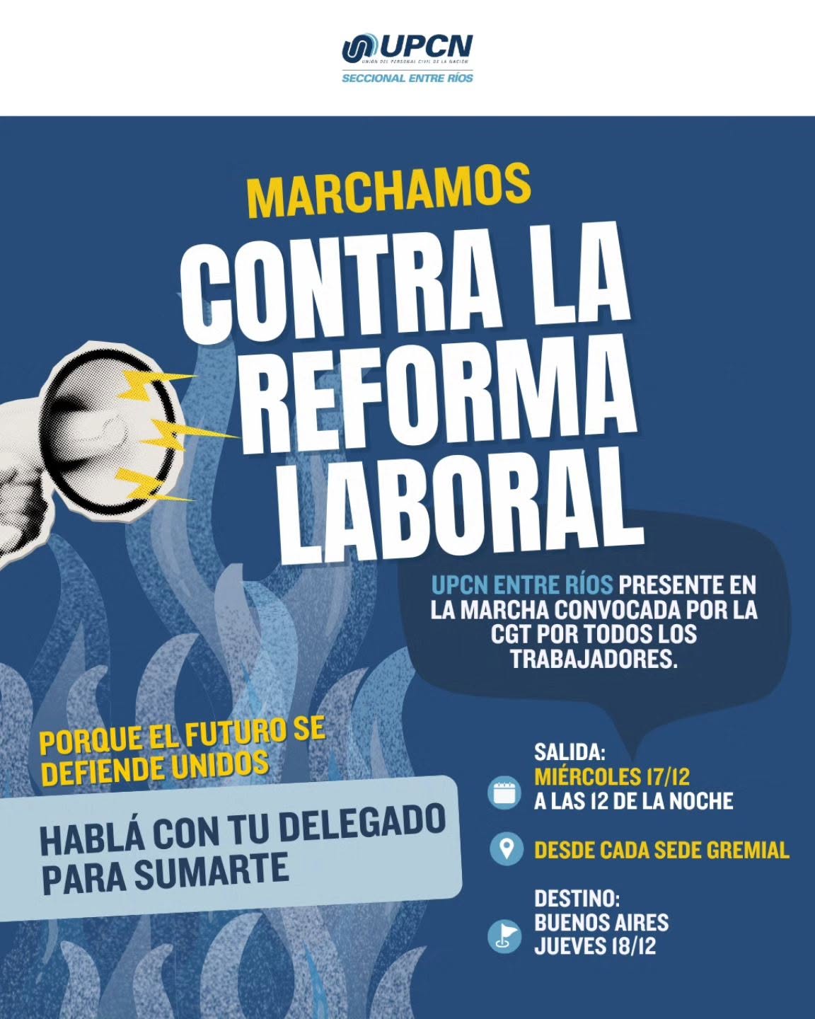 La Unión del Personal Civil de la Nación (UPCN) Entre Ríos expresó un fuerte repudio al proyecto de reforma laboral que impulsa el Gobierno nacional, al que consideró “peligroso” y contrario a la Constitución y a los tratados internacionales que protegen el trabajo digno. En ese marco, el gremio anunció que movilizará “en forma masiva y desde todos los lugares de la provincia” a la marcha convocada por la Confederación General del Trabajo (CGT).